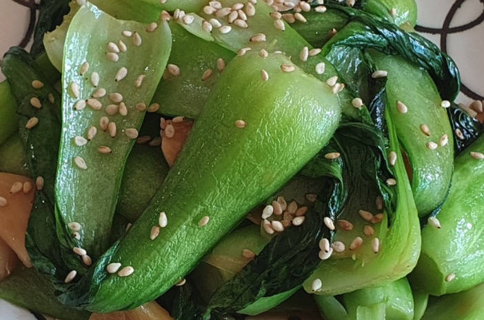 5. 그리고 청경채와 당근을 넣어 청경채의 수분이 죽을 때까지 볶아주세요.