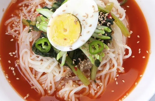 - 그릇에 물기를 제거한 국수를 담고, 그 위에 양념한 김치와 채썬 오이를 올려줍니다. 이후 시원하게 만들어둔 국물을 부었습니다.