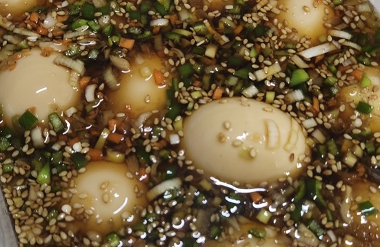 계란 7개, 간장 1컵, 설탕 1컵, 물 1컵, 청양고추 4개, 당근 1움큼, 양파 1/4개, 파 한 움큼, 식초, 소금