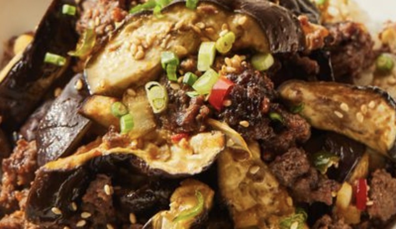 13. 그릇에 밥을 넣고 튀긴 가지를 올린 후 가지덮밥 소스를 부어줍니다.