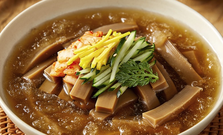 - 사발에 조합하기: 도토리묵, 오이, 김치 양념을 사발에 넣고, 육수를 충분히 부어준다.